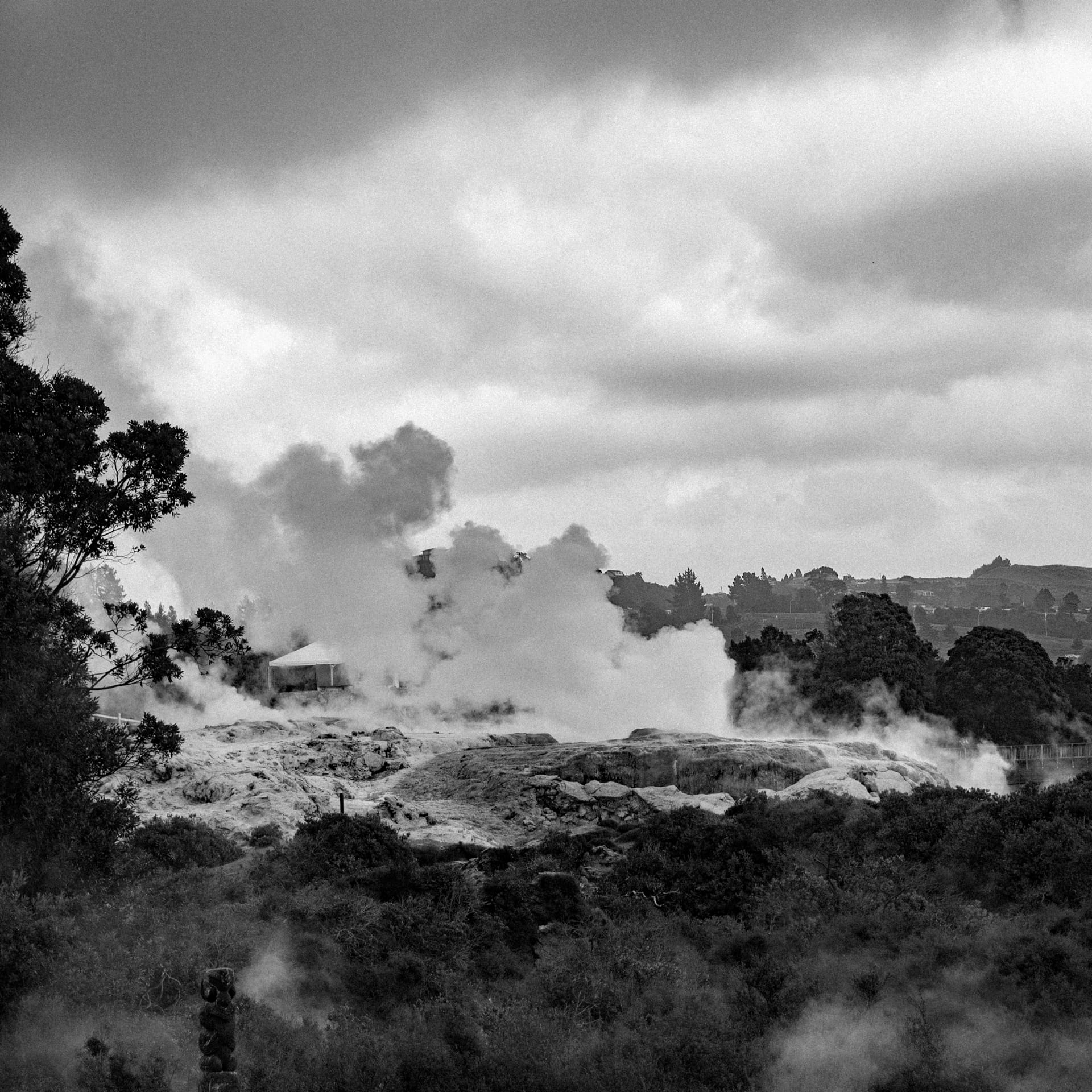 Ein nächstes Ziel von uns war die Stadt Rotorua, welche ziemlich eindrücklich und besonders ist. Die Stadt und Umgebung sind stark geprägt von geothermischer und vulkanischer Aktivität. Was einem als erstes auffällt, ist der eigenartigen allgegenwärtigen Geruch nach Schwefel. Bei einem Spaziergang durch einen Park liefen wir an so einigen blubbernden Tümpeln und rauchenden Erdspalten entlang, die großzügig abgesperrt waren. An einer Stelle war ein großer, kochender Teich, der ziemlich viel Wasserdampf produzierte. Es führte auch eine Brücke über den Teich, sodass man mitten durch den heißen Wasserdampf ging, das alles natürlich begleitet von ziemlich starkem Schwefelgeruch. Es war eine eindrückliche Erfahrung, aber auch ganz schön unangenehm, vor allem bei 30 Grad in der Sonne. In der Gegend findet man aber auch immer wieder Bademöglichkeiten in natürlichen heißen Quellen, die dann nur 38 - 40 Grad heiß sind, was dann wirklich sehr angenehm sein kann.
